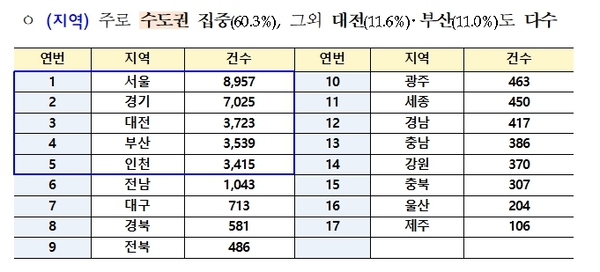 대구는 713건, 경북은 581건으로 수도권에 비해 비교적 적은 편이지만 전세계약시 항상 주위와 경계가 필요하다.