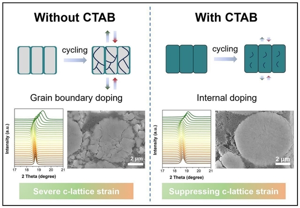 연구팀은 배터리 수명 저하의 근본 원인인 'c-축 격자 왜곡(c-lattice distortion)' 현상에 주목했다. 충전과 방전이 반복되면서 배터리 내부 원자 배열 구조가 점진적으로 변형되고, 이로 인해 미세 균열이 발생해 전체 구조가 손상되는 메커니즘이다.