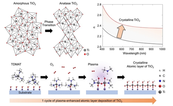 연구팀은 실리콘 산화물(SiO₂) 기판 위에 티타늄 산화물(TiO₂)을 얇게 증착하는 방식으로 이러한 문제를 해결했다. 기존 비정질 실리콘 산화물의 낮은 굴절률 한계를 극복하기 위해, 250℃ 이하의 저온에서 티타늄 산화물을 결정질 상태로 만들어 굴절률을 기존 대비 0.43 향상시켰다.