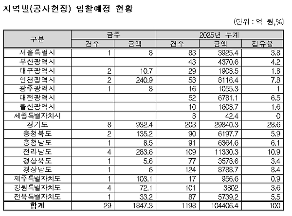 지역업체의 참여 기회도 크게 확대된다. 이번 주 집행 예정인 29건 중 28건이 지역제한 입찰 또는 지역의무 공동도급 대상 공사로, 전체 공사비의 55%에 해당하는 1,021억원을 지역업체가 수주할 수 있을 것으로 예상된다고 조달청은 밝혔다.