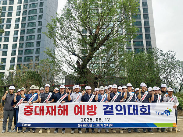 ㈜삼구 트리니엔 시그니처 아파트 현장에서 ㈜삼구 임직원들이 중대재해 예방 결의대회를 개최했다.