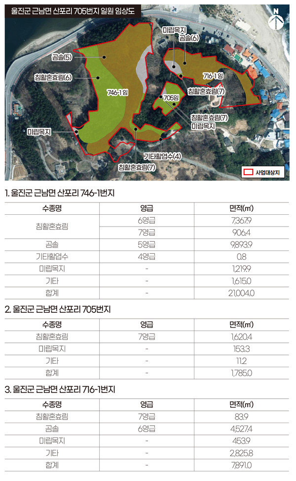 근남면 산포리 705번지는 1785㎡ 면적 가운데 수목 70년생 7영급 침활혼효림 면적이 90%인 1620㎡에 달하고 있다.