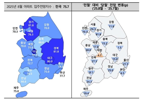 광역시 중에서는 대전만이 소폭 상승(87.5→91.6)했고, 나머지 부산(-6.5p), 대구(-15.0p), 광주(-8.1p), 울산(-21.5p), 세종(-17.8p) 등은 일제히 하락했다. 도지역 역시 충남(-30.0p), 전북(-27.3p), 경남(-25.0p), 전남(-24.3p) 등 전 지역에서 하락세를 면치 못했다.