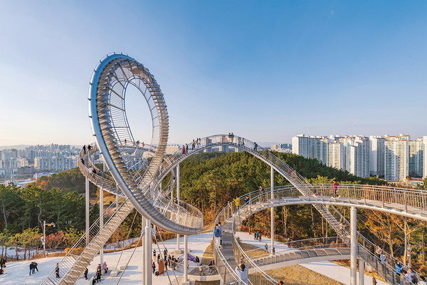 그러나 실제로는 계단을 따라 직접 걸을 수 있는 체험형 조형물로, 한 걸음 오를 때마다 시야가 넓어진다.