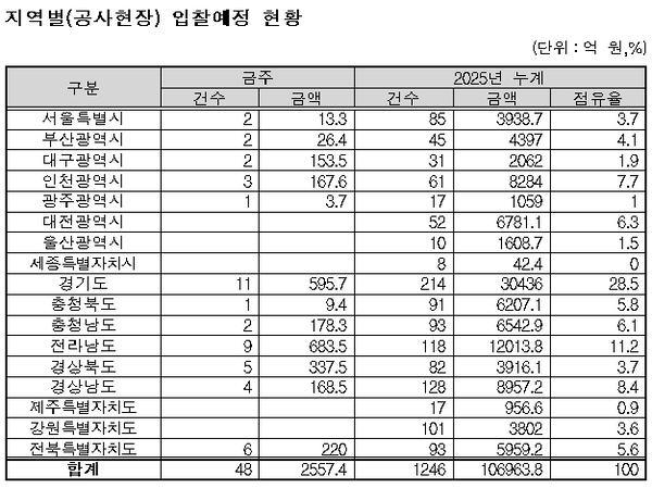 조달청은 이번 주 집행 예정인 48건 중 46건이 지역제한 입찰 또는 지역의무 공동도급 대상공사라고 밝혔다. 이를 통해 1,372억원 상당(전체의 54%)을 지역업체가 수주할 수 있을 것으로 예상된다고 설명했다.