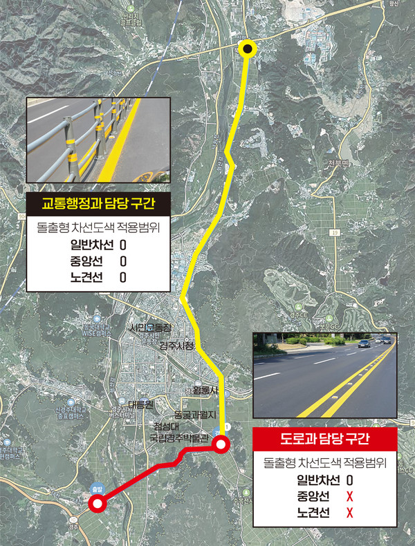 교통행정과 담당자는 “발주 당시 도로과 담당자에게 돌출형 차선의 중앙선 적용 내용을 알리고 도로과가 맡은 서라벌대로 구간에도 동일하게 적용하자는 의견을 전달했으나 실제 이뤄지지는 않았다”고 말했다.