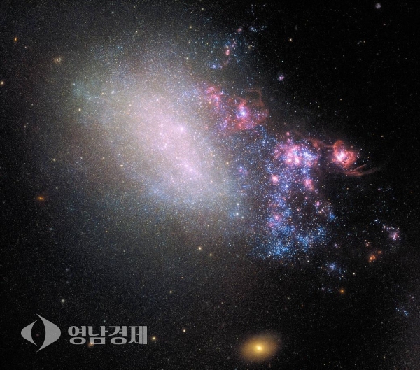 17일 허블망원경을 운용하는 '우주망원경과학연구소(STScI)'에 따르면 이 이미지에 포착된 은하는 약 2천500만 광년 떨어진 '사냥개자리'에 있는 NGC 4485. 이보다 더 큰 은하인 NGC 4490이 인근을 지나면서 비껴가듯이 충돌한 뒤 현재는 2만4천 광년가량 떨어져 있다.