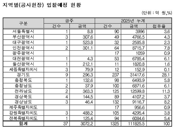 조달청은 2025년 누계 기준으로 총 1,325건, 11조 1,825억원 상당의 시설공사 입찰을 집행했다고 전했다. 이 중 지역제한 입찰과 지역의무 공동도급을 통한 지역업체 참여 규모는 7조 5,599억원에 달한다고 밝혔다.