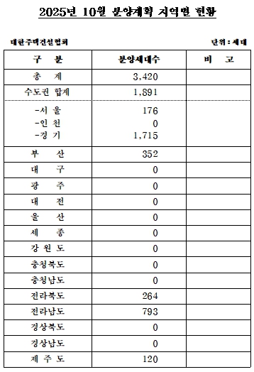 대한주택건설협회(회장 정원주)가 발표한 ‘2025년 10월 주택 분양계획’에 따르면, 이번 달 전국적으로 총 3420세대가 공급될 예정이다. 이는 전월 대비 15%, 전년 동월 대비 37% 줄어든 수치다.