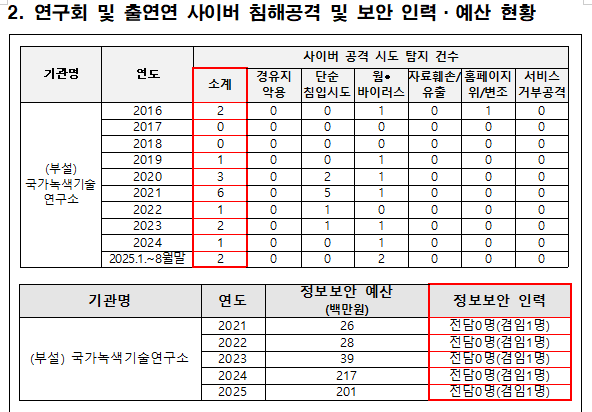 특히 국가녹색기술연구소는 전담 보안인력이 단 한 명도 없고, 겸임 직원 1명이 보안업무를 겸하고 있는 것으로 확인됐다.