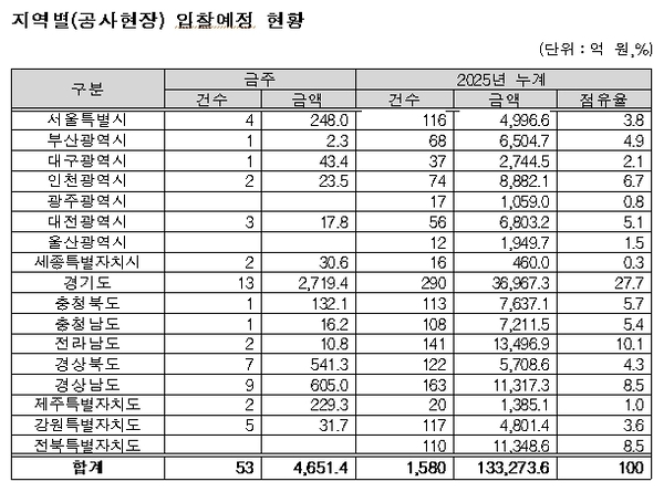 이 가운데 경상북도는 541억 원, 대구광역시는 43억 원 규모의 공사가 각각 예정되어 있어, 지역업체 참여 확대와 지역경제 순환효과가 기대된다.
