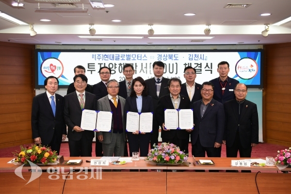 도와 김천시는 지난 13일 김천시청 회의실에서 전우헌 경제부지사, 김충섭 김천시장, 현대글로벌모터스 대표, 미국에이알씨 한국지사장, 도의원 등 30여 명이 참석한 가운데 자동차 첨단 신소재 생산공장 신축을 위한 투자양해각서(MOU)를 체결했다.