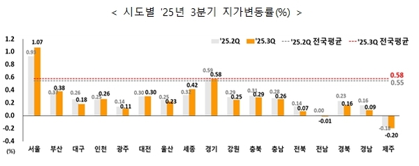 수도권이 여전히 상승세를 견인했다. 수도권 지가는 0.80%로 2분기(0.74%)보다 오름폭이 커졌으며, 반면 지방권은 0.19%로 0.03%포인트 하락했다.