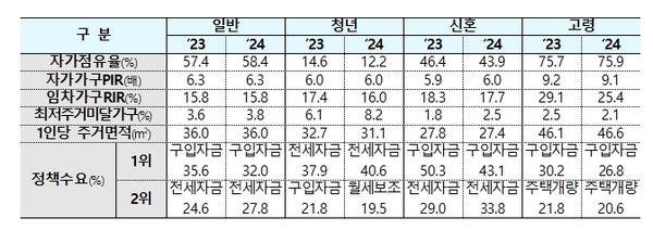 특성 가구별로는 청년가구와 신혼부부의 주거 여건이 다소 악화된 반면, 고령가구는 전반적으로 개선됐다. 청년가구의 자가점유율은 12.2%로 전년(14.6%) 대비 2.4%포인트 하락했고, 신혼부부도 43.9%로 전년(46.4%) 대비 2.5%포인트 감소했다.