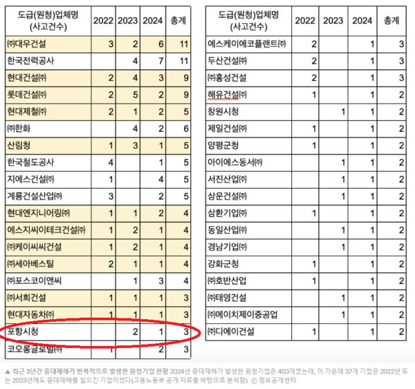 고용노동부 자료에서 대우건설, 현대건설, 포스코이앤씨 같은 대기업, 한국전력공사, 산림청 같은 국가기관과 함께 포항시청이 명단에 등장한 것은 지자체의 안전관리 역량과 시스템을 근본적으로 재점검해야 한다는 강력한 경고로 받아들여진다.