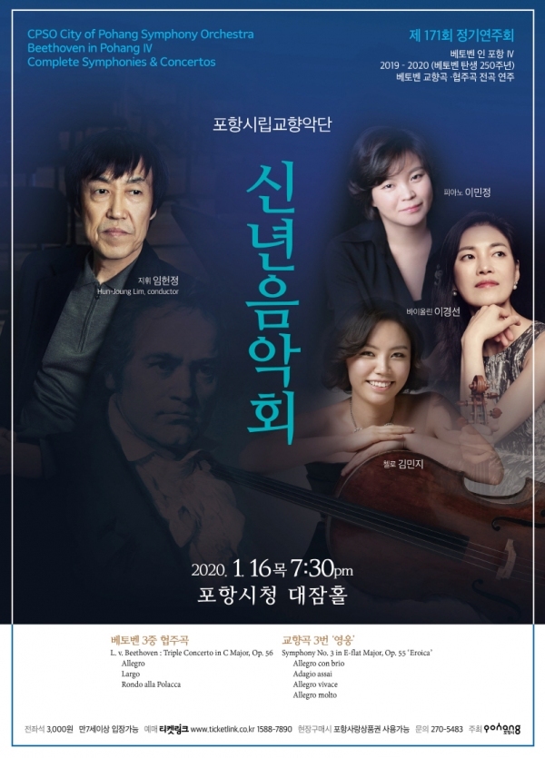 이번 신년음악회는 전통적인 신년 프로그램인 비엔나 왈츠 연주 중심이 아닌 베토벤 탄생250주년을 맞아 베토벤 프로그램으로 진행된다. 시립교향악단은 지난해부터 올해에 걸쳐 ‘베토벤 in 포항’ 시리즈를 이어가는 가운데 이번 신년음악회는 그 네 번째 기획으로 베토벤의 삼중협주곡과 영웅교향곡이 연주된다.