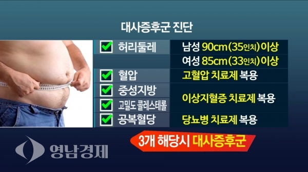 대사증후군은 ▲복부비만 ▲고혈압 ▲고혈당 ▲좋은 콜레스테롤(HDL) 혈중수치 표준 이하 ▲중성지방 과다 등 5가지 중 3가지 이상이 해당하는 경우로 이런 사람들은 심혈관질환, 당뇨병이 나타날 가능성이 크다.