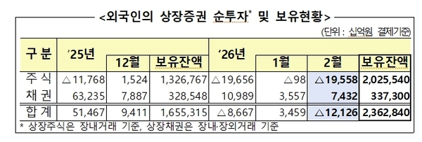 2월 말 기준 외국인의 국내 증권 보유 규모는 총 2362조8000억원으로 집계됐다. 이 중 상장주식이 2025조5000억원으로 전체 시가총액의 32.6%를 차지했으며, 상장채권은 337조3000억원으로 상장잔액의 12.0%를 기록했다.