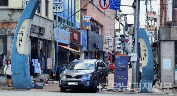 ▲ ⓒ백진호 기자 구미시 원평동 소재 문화로는 보행자 전용도로 구미시가 ‘젊음의 거리 문화의 거리’로 지정·운영하고 있다. 문화거리는 차량이 아닌 보행자를 위한 보도블록으로 시공을 했으나 이곳에 차량이 다니면서 도로 파손은 물론 보행자가 교통 사고에 무방비로 노출되고 있다. 더욱이 차량 통행을 막기 위해 설치한 봉을 아슬하게 피해 이곳을 통과하는 불법 차량에도 구미시는 단속조차 하지 않고 있다.
