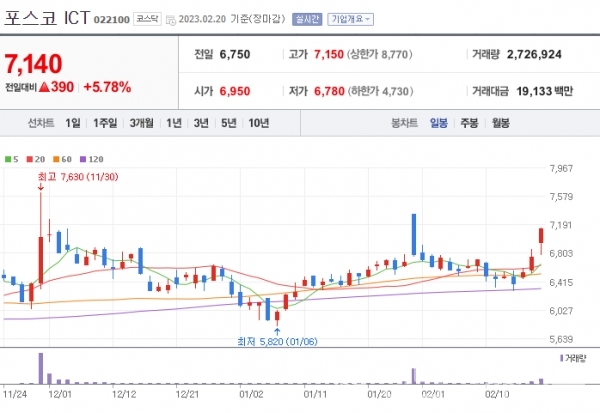 이날 포스코ICT의 주가는 전일대비 390원, 5.78%p 상승한 7천140원으로 장을 마감해 강보합세로 부진한 모습을 보인 국내 증시 속 두각을 나타냈다.