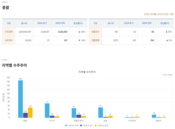 지역별 수주 현황을 살펴보면, 중동이 49억6천만 달러로 전체의 60%를 차지하며 가장 높은 비중을 보였다. 이어서 유럽이 9억2천만 달러(11%), 북미·태평양이 8억5천만 달러(10%) 순으로 나타났다.