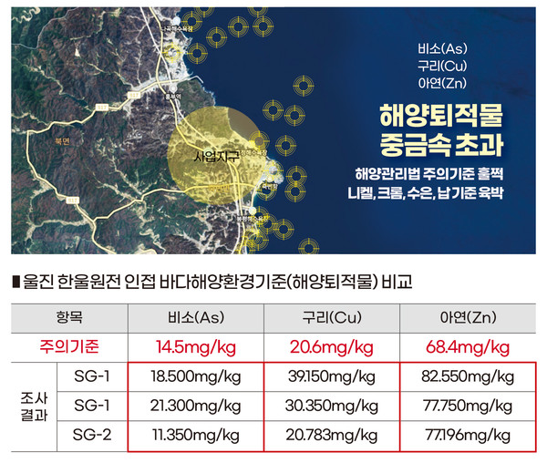 울진원자력수소국가산업단지 조성에 따른 환경영향평가(초안)에 따르면 해양퇴적물에 대한 중금속 오염도 측정(올해 7월 23일) 결과 비소(As), 구리(Cu), 아연(Zn) 등 중금속이 해양관리법에서 정한 주의기준을 초과했다.