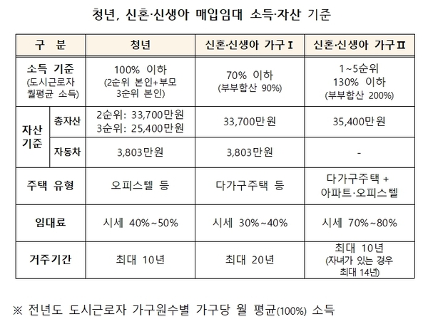 신혼·신생아 매입임대주택은 무주택 신혼부부를 대상으로 두 가지 유형으로 나뉘어 공급된다. 신혼·신생아I 유형은 1101호 규모로 도시근로자 가구당 월평균 소득의 70%(맞벌이 90%) 이하 가구에 시세 30~40% 수준의 임대료로 제공된다. 신혼·신생아II 유형은 1145호로 소득 130%(맞벌이 200%) 이하 가구가 대상이며, 시세 70~80% 수준의 임대료가 적용된다.
