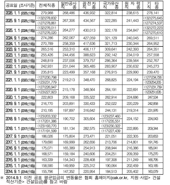 가장 많은 인력이 분포한 일반공사 직종(91개) 평균임금은 26만8,486원으로 나타났다. 이는 2025년 9월에 26만7306원, 2025년 1월에 26만4,277원과 비교해 각각 0.4%, 1.6% 상승한 수준이다.
