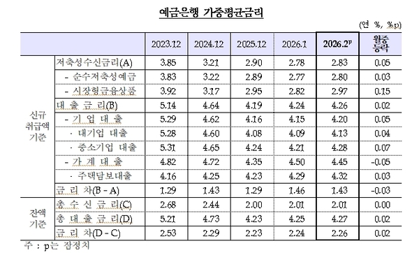 2월 신규취급액 기준 예금은행 대출금리는 연 4.26%로 전월 대비 0.02%포인트 상승했다고 한국은행이 발푯했다. 반면 저축성수신금리는 연 2.83%로 0.05%포인트 올라 예대금리차는 1.43%포인트로 전월보다 0.03%포인트 축소됐다.